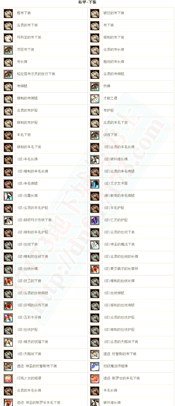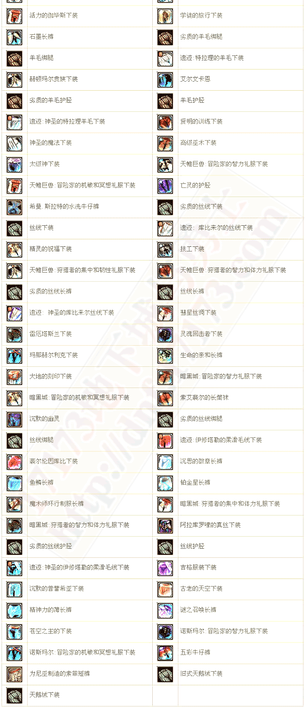 | 传承:神圣之斯罗尼羊毛下装 | 20 | HP MAX+90~98 MP MAX+56~59 | |