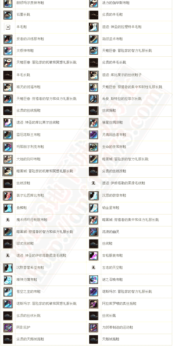 | 彗星丝绸凉鞋 | 35 | 钝足抗性+8~12 移动速度+5.5% | |