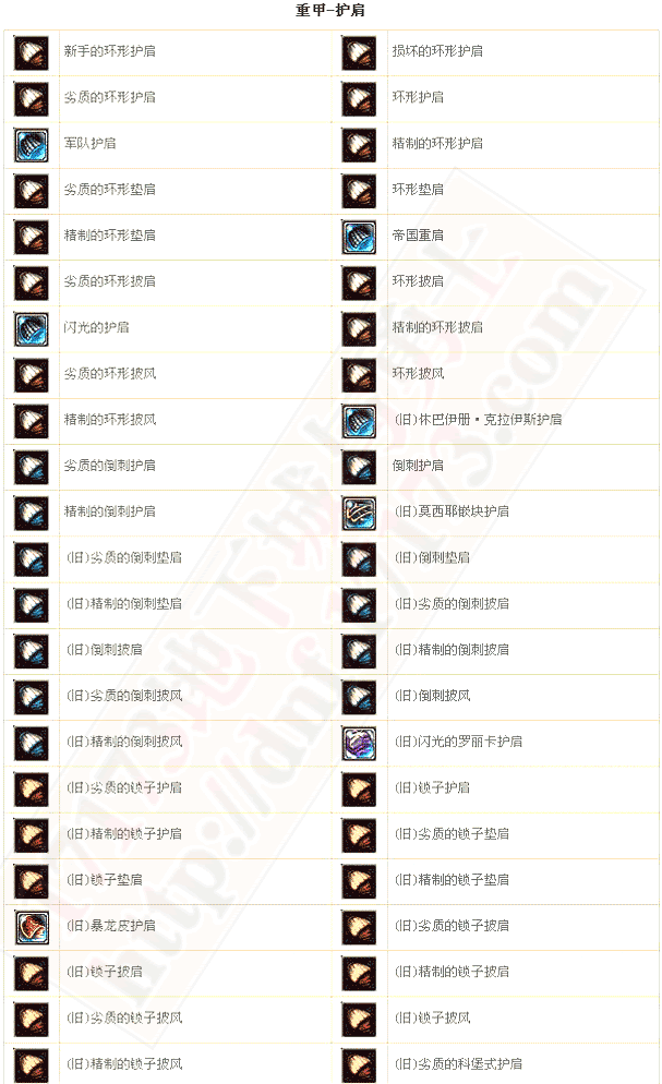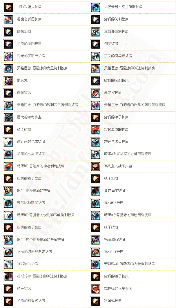 | 黄铜尖刺护肩 | 40 | HPMAX+98~104 | HPMAX+291~309 [血之守护]技能Lv+1 [死亡抗拒]技能Lv+1 [怒气爆发]技能Lv+1 |