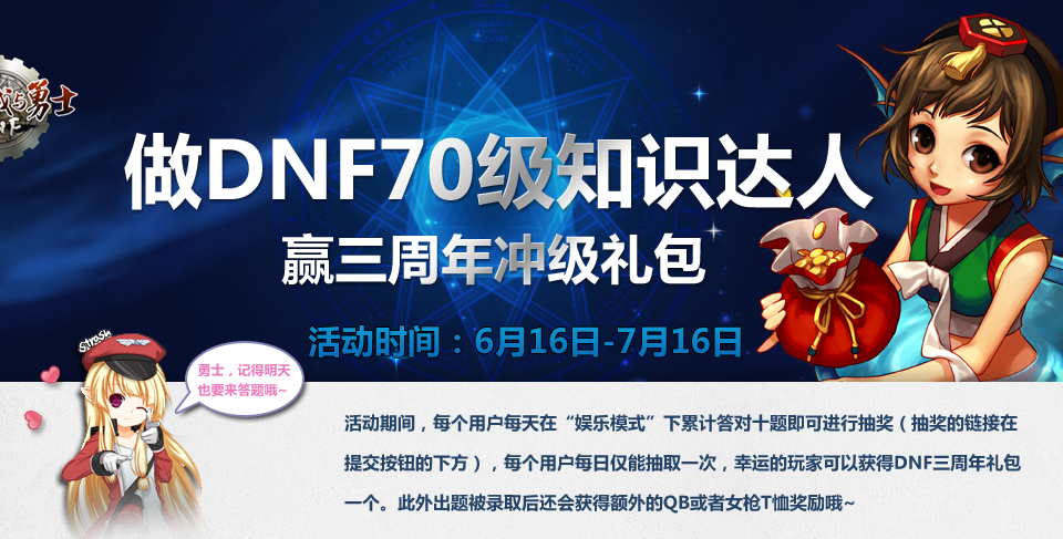 每天两题答对累计10题即可抽奖,幸运的玩家可以获得DNF三周年冲级礼包兑换序列号或女枪手办等实物奖励。每周提交问题排行前15的玩家可以获得20QB奖励,共计1200QB奖励。