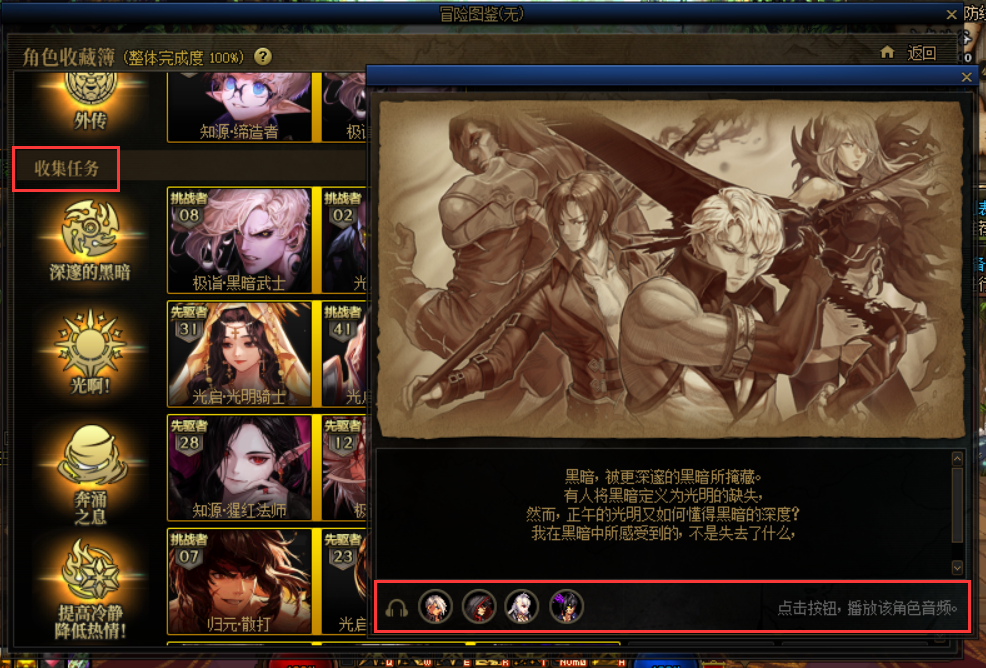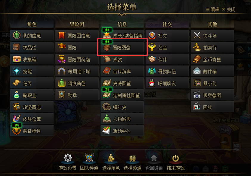 冒险图鉴可以通过ESC菜单中进入,之前版本当中的怪物图鉴、角色收藏簿、成就等系统全部囊括在新版冒险图鉴当中。