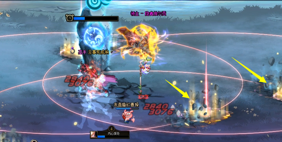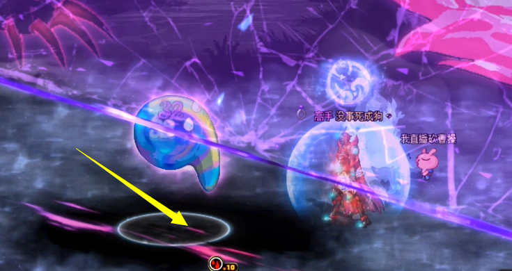 领主的攻击判定也分内外圈,内圈涨满后,攻击判定不再跟随角色移动,外圈涨满,领主开始攻击,主要不要让紫色攻击打到紫色能量球上。