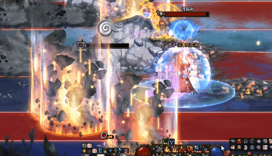 该形态下也有着红色紫色攻击判定同时存在的扇形攻击,仔细观察不难发现紫色延迟爆炸的时间要稍长一点,所以我们可以现在紫色区域躲避红色区域的攻击,然后再走到红色区域躲避紫色区域的攻击,如果一开始就站在红色区域会被致盲,要赶快走开。