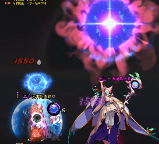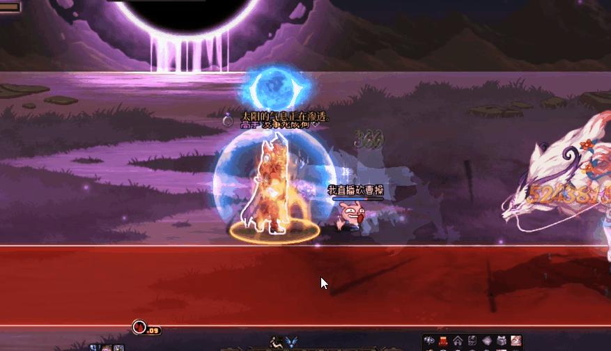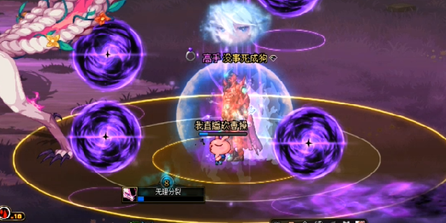 招式1:无理分裂,生成紫色能量球,可以吃金色狐狸触碰消除,也可以利用领主的金色攻击消除。